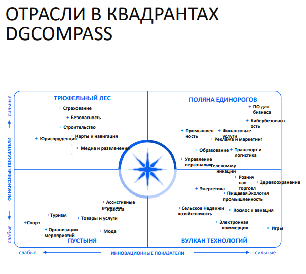 На основе авторской методологии все отрасли распределены по четырём квадрантам — компасу инноваций и денег: